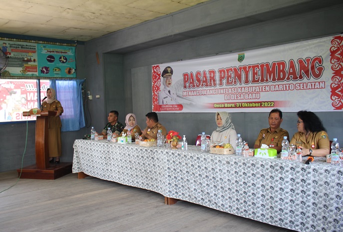 Diskominfo Barsel – Buntok – Pj. Bupati Barito Selatan Lisda Arriyana menghadiri pelaksanaan pasar penyeimbang dalam rangka pengendalian inflansi daerah yang berlangsung di aula kantor Desa Baru, Senin (31/10/2022). Pemerintah Kabupaten Barito Selatan saat ini tengah fokus mengendalikan inflasi daerah akibat kenaikan harga BBM. Pasar penyeimbang adalah sebagai bentuk upaya pemerintah daerah untuk menjaga kestabilan harga barang kebutuhan pokok dan barang penting di pasaran sehingga dapat mengendalikan laju inflasi yang terjadi di daerah. Lisda Arriyana dalam sambutannya mengatakan, dalam pelaksanaan pasar penyeimbang tahun 2022 yang dilaksanakan hari ini di Desa Baru merupakan salah satu wujud perhatian pemerintah Kabupaten Barito Selatan untuk mengurangi angka inflansi daerah. Pada moment pelaksanaan pasar penyeimbang terkait pengendalian inflansi daerah, diharapkan menjadi sarana bagi seluruh lapisan masyarakat untuk memenuhi kebutuhan bahan pokok sehari-hari dengan harga ekonomis dan lebih murah dari harga pasar pada umumnya. “Hal ini merupakan bentuk keseriusan kami baik selaku pemerintah maupun pribadi, untuk meringankan beban masyarakat yang terdampak inflasi ini,” ungkap Lisda. Pasar penyeimbang adalah sebagai bentuk upaya pemerintah daerah untuk menjaga kestabilan harga barang kebutuhan pokok dan barang penting di pasaran sehingga dapat mengendalikan laju inflasi yang terjadi di daerah. Paket yang disediakan untuk dijual berupa telor ayam 10 butir, susu kental manis 1 kaleng, minyak goreng ,gula pasir 1 kg dan sirup 1 botol , dengan nilai paket tersebut Rp50.000. Turut hadir Wakil Ketua DPRD Barito Selatan Nyimas Artika, Plt. asisten II dan asisten III, Kepala Organisasi Perangkat Daerah Kabupaten Barito Selatan, Camat Dusun Selatan, Kepala desa, dan masyarakat Desa Baru. (diskominfobarsel//Hn2r.)